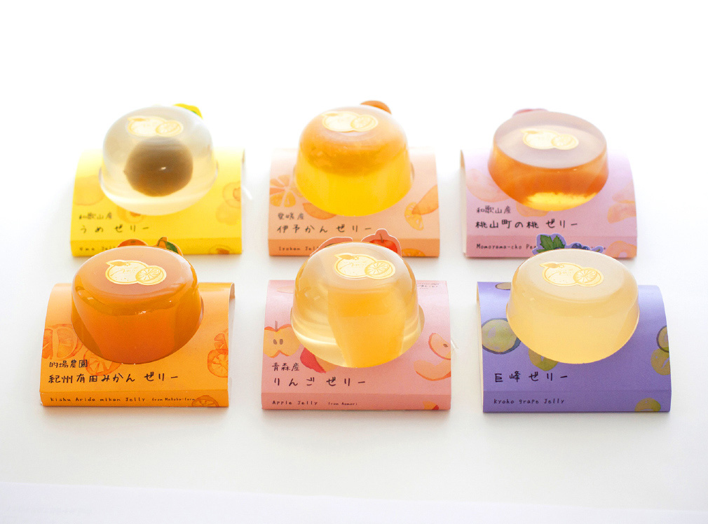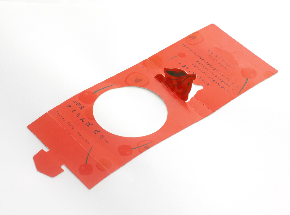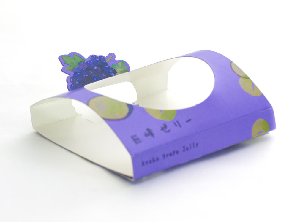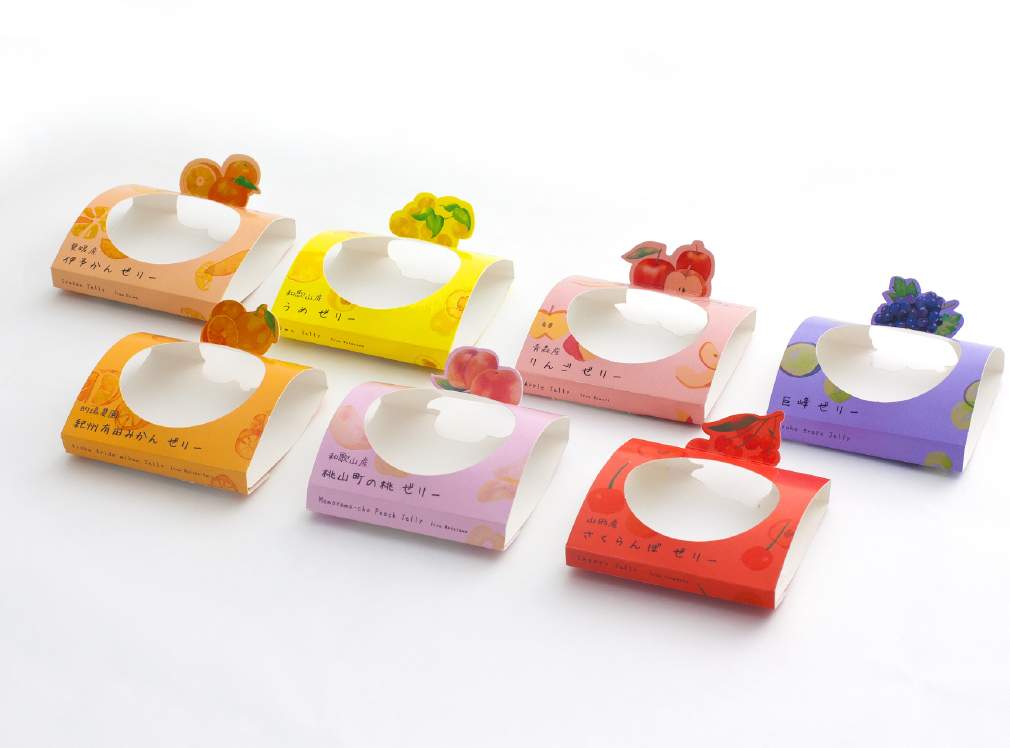ゼリーのスリーブにフルーツごとの切り抜き加工を施し、立ち上がるしかけに。